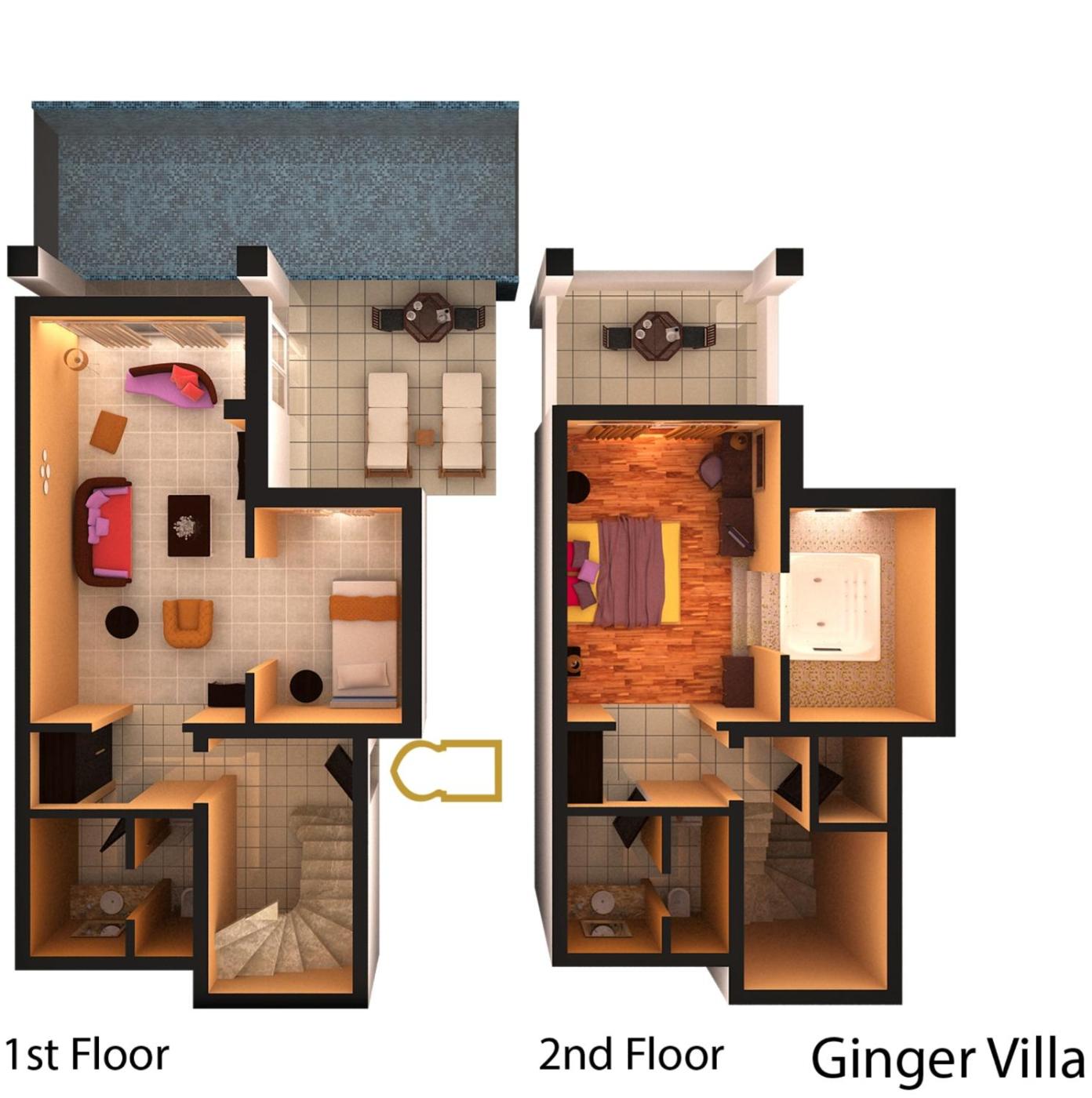 Villa Ginger. Offering direct access to the pool, this villa consists of one bedroom with a large spa bath, a living-room and 2 bathrooms. ;